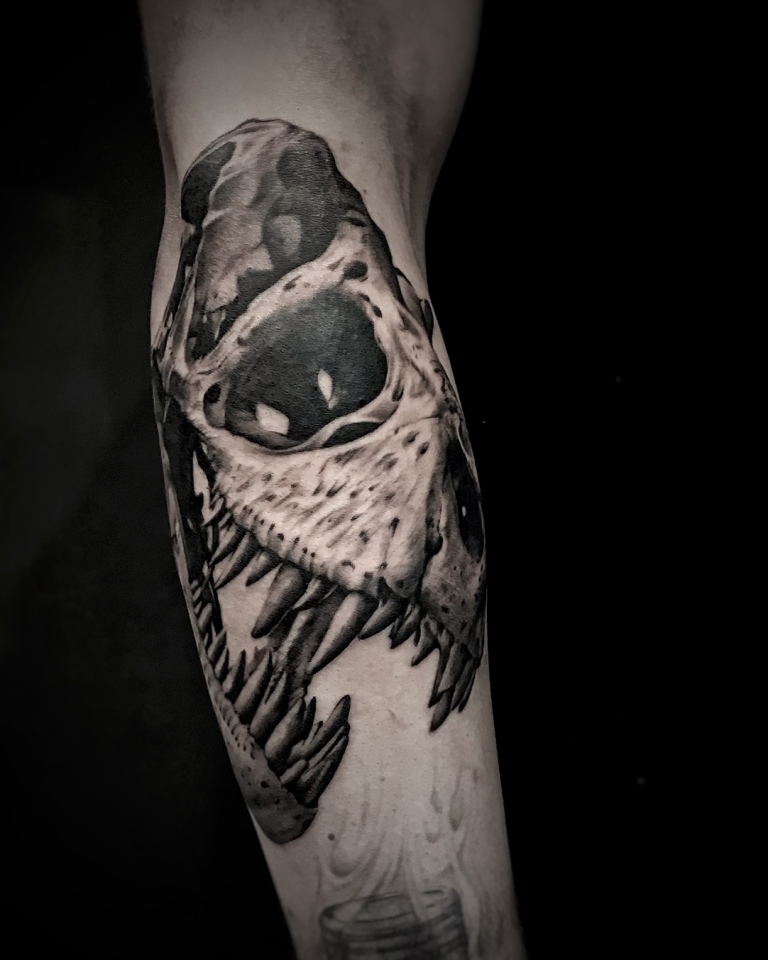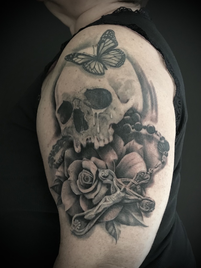 Je propose des tatouages personnalisés ou des reproductions noir & gris d’après vos photos ou références (portraits, animaux, fleurs, skulls, etc.).